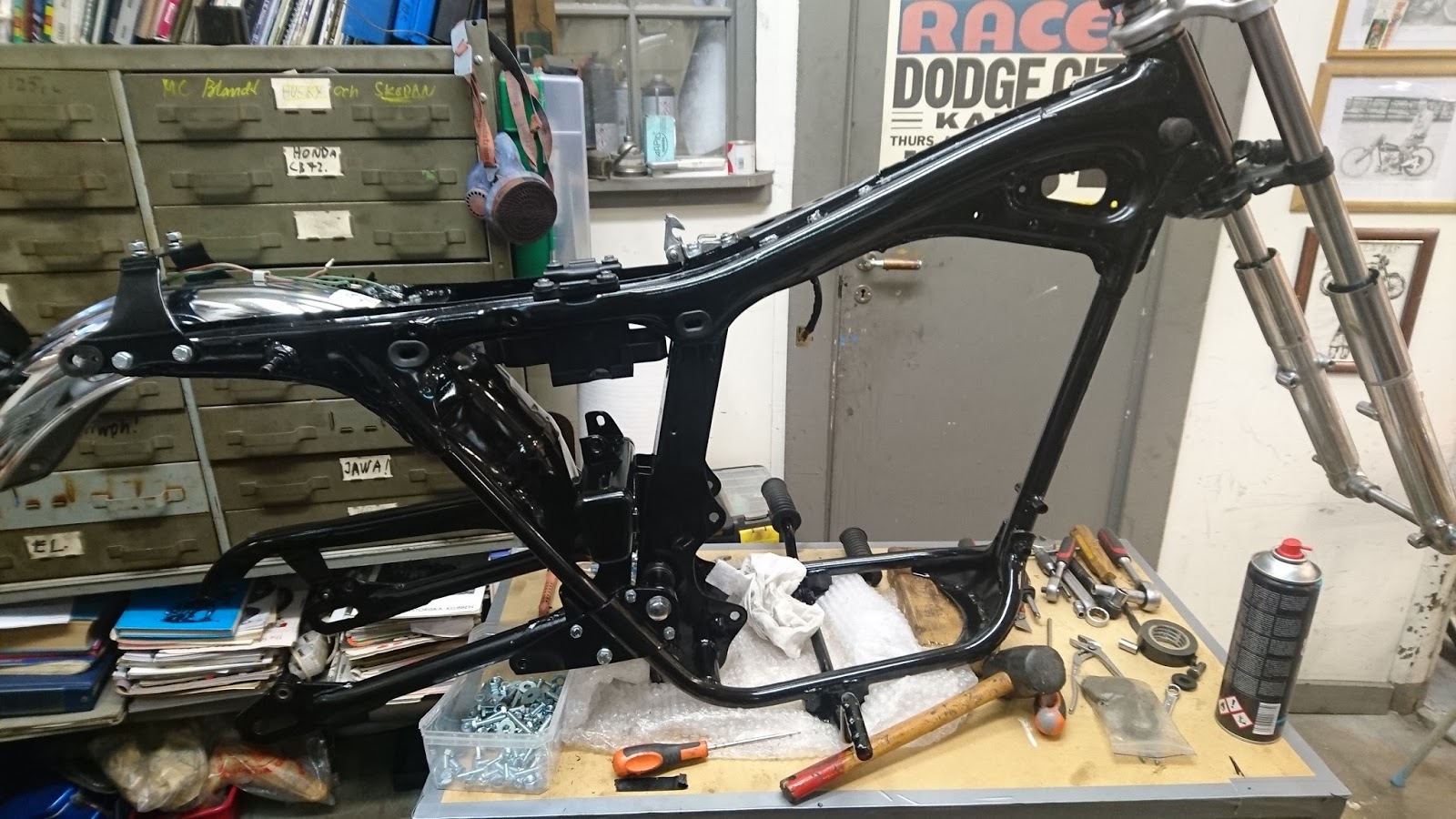 Yamaha DS7 250 på operations bordet. Denna motor med ram och annat smått och gott har sitt ursprung från Stigtomta Skrot. En gång en brinnande Yamaha som förpassats till långvarig vila. Nu ska den få lite uppskattning och värme. Enligt ryktet hade den gått väldigt lite innan den tog eld vilketverkar stämma när jag synar innehållet. Veven får ändå åka till Stigs Motormekaniska i Axvall och så blir det att hona och blästra vilket redan är gjort så motorn blir en lätt match, värre med det övriga.